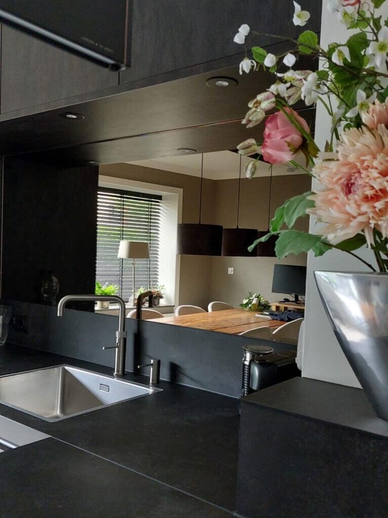 Si le mur du fond de votre cuisine est carrelé, vous pouvez l’égayer avec plusieurs miroirs individuels de la même taille que les carreaux. C’est aussi une motivation instantanée pour garder votre cuisine en ordre – car si vous laissez la vaisselle dehors, elle aura l’air deux fois plus en désordre à cause du mur en miroir ! Veillez simplement à ce que votre miroir n’entre pas en contact avec une source de chaleur.
