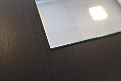 Un miroir à facettes, quant à lui, se caractérise par le bord biseauté distinctif qui y est taillé. La largeur de ce bord (la facette) dépend de l’épaisseur du verre et de l’angle auquel il est taillé, mais son épaisseur est généralement comprise entre 10 et 40 millimètres. Il est important de noter que lorsqu’un miroir n’a qu’une finition à facettes, les bords peuvent encore être tranchants. C’est pourquoi nous recommandons que les miroirs à facettes soient souvent polis à plat.